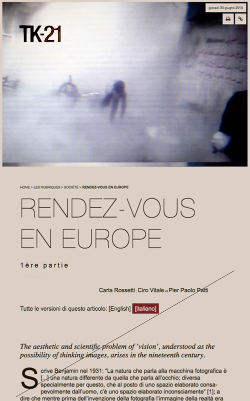 Rendez-vuos en Europe testo di Carla Rossetti Scrive Benjamin nel 1931: “La natura che parla alla macchina fotografica è [...] una natura differente da quella che parla all’occhio; diversa specialmente per questo, che al posto di uno spazio elaborato consa- pevolmente dall’uomo, c’è uno spazio elaborato inconsciamente” [1]; a dire che mentre prima dell’invenzione della fotografia l’immagine della realtà era necessariamente un artefatto plasmato dall’osservazione e dalla manualità umane, dal 1839 essa diventa invece il prodotto della raffinatezza tecnica di una macchina.Col passare del tempo, le cose sembrano essersi ulteriormente complicate: lo slittamento semantico subito dalla parola video – termine che nel mondo latino indicava una capacità sovrana di ogni essere vivente e ora designa invece le potenzialità tecnologiche di un oggetto meccanico – ci ricorda come mezzi elettronici quali il cinema, la fotografia, la televisione siano capaci di offrire possibilità di esplorazione del mondo totalmente inedite e, attraverso la manipolazione elettronica, addirittura quella di intervenire su di esso.